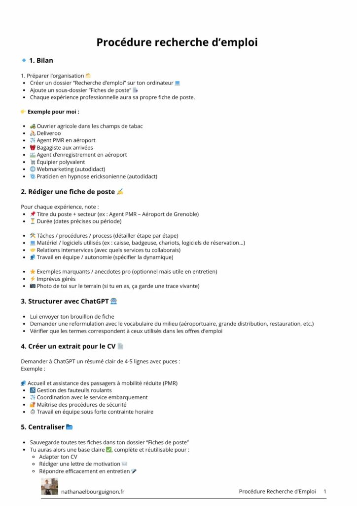 Puis je l’ai passé à la moulinette de Chatgpt. J’ai fait un copié collé et je lui ai demandé de ré écrire au propre ma procédure de recherche d’emploi en ajoutant quelques smileys pour illustrer le texte.